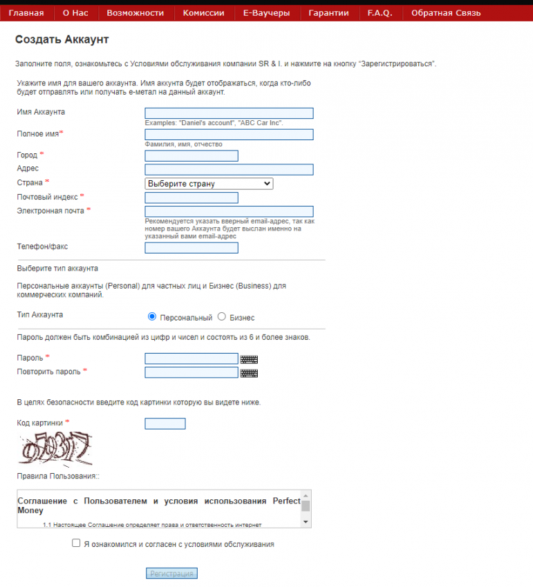 Для начала вам нужно открыть сайт Perfect Money и в самом верхнем меню нажать на кнопочку "регистрация". После этого вы увидите такое окно: