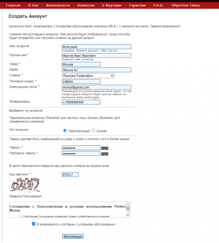 Тут необходимо заполнить все поля с красной звёздочкой. Важно: если вы в будущем планируете пройти верификацию (подтверждение личности), то вводим свои реальные данные, в том числе и номер телефона. Верификация позволит значительно снизить комиссию за переводы. Если же планируете пользоваться кошельком анонимно, вбиваем любые имя с фамилией, адрес, индекс и прочее. Электронную почту обязательно указываем вашу действующую, туда, после регистрации придёт письмо с вашим id, который необходим для входа в кошелёк. Не забываем поставить галочку внизу слева от пункта "я ознакомился и согласен..." и жмём кнопку "Регистрация". Пароль должен содержать буквы (английские) и цифры, обязательно его куда-то записываем/сохраняем, ибо по нему мы будем заходить в свой кошелёк. Пример заполнения всех полей представлен ниже: