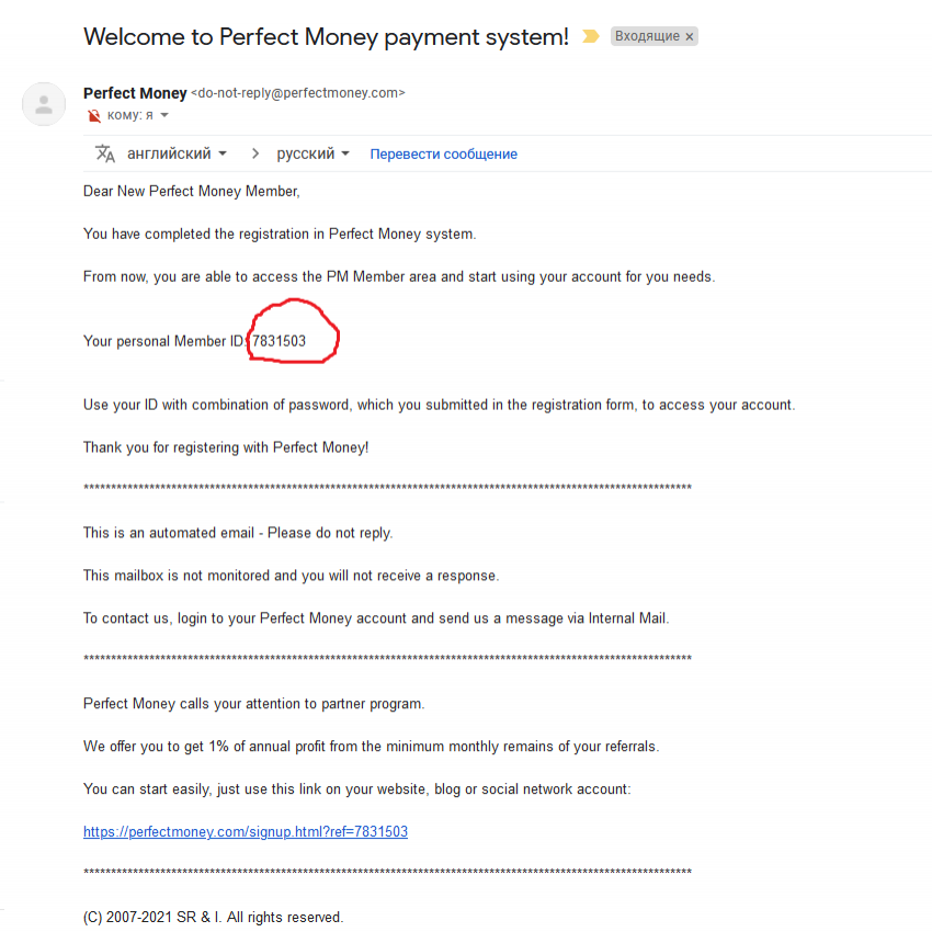 Теперь нужно зайти в свой почтовый ящик, который вы указывали на этапе регистрации. Там вы увидите письмо от пёфекта, в котором найдёте ваш id. Выглядеть это будет так: