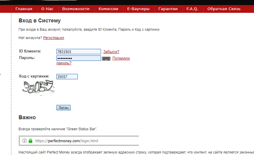 Возвращаемся на сайт Perfect Money и в самом верхнем меню нажимаем на кнопочку "вход". В открывшемся окне вводим id полученный на почту, пароль, который вы указывали на первом этапе регистрации и капчу, нажимаем "логин". Пример: