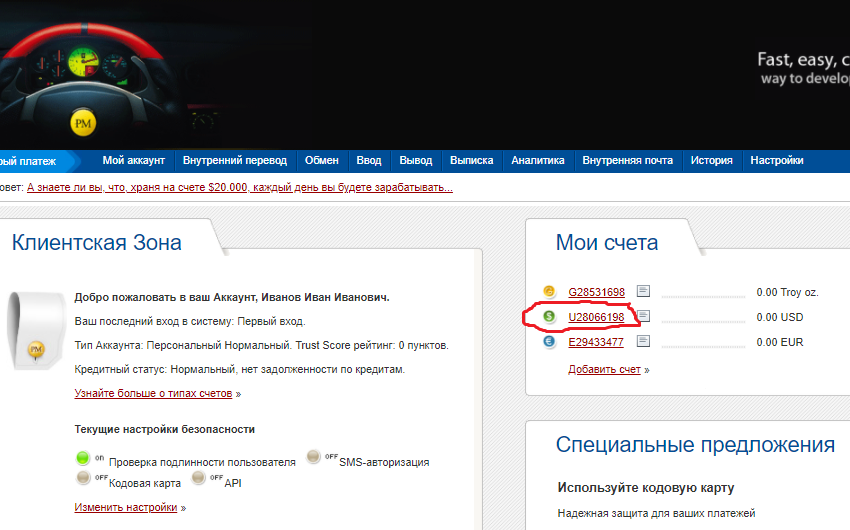 Поздравляем, вы завели себе кошелёк и можете им пользоваться. После успешного входа, вы попадёте в ваш кабинет. В нём, в разделе "мои счета", вы увидите 3 счёта, основной долларовый, который нас интересует, начинается на "U" Это и есть номер вашего кошелька, который вы будете указывать в проектах для вывода средств. В нашем примере это U28066198