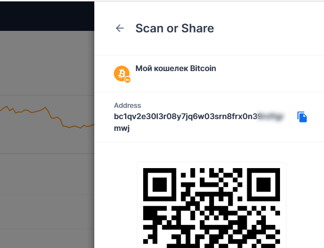 Кнопочка "Send" в верхнем меню позволяет отправлять ваши криптоактивы. А кнопочка "Request" используется "для приёма" - позволяет увидеть адреса ваших кошельков (как правило, это набор латинский букв и цифр). Для примера, я нажал Request и выбрал "мой кошелёк BitCoin", на экране появился адрес, который можно использовать для перевода мне биткоинов (с проектов, в обменниках и так далее):
