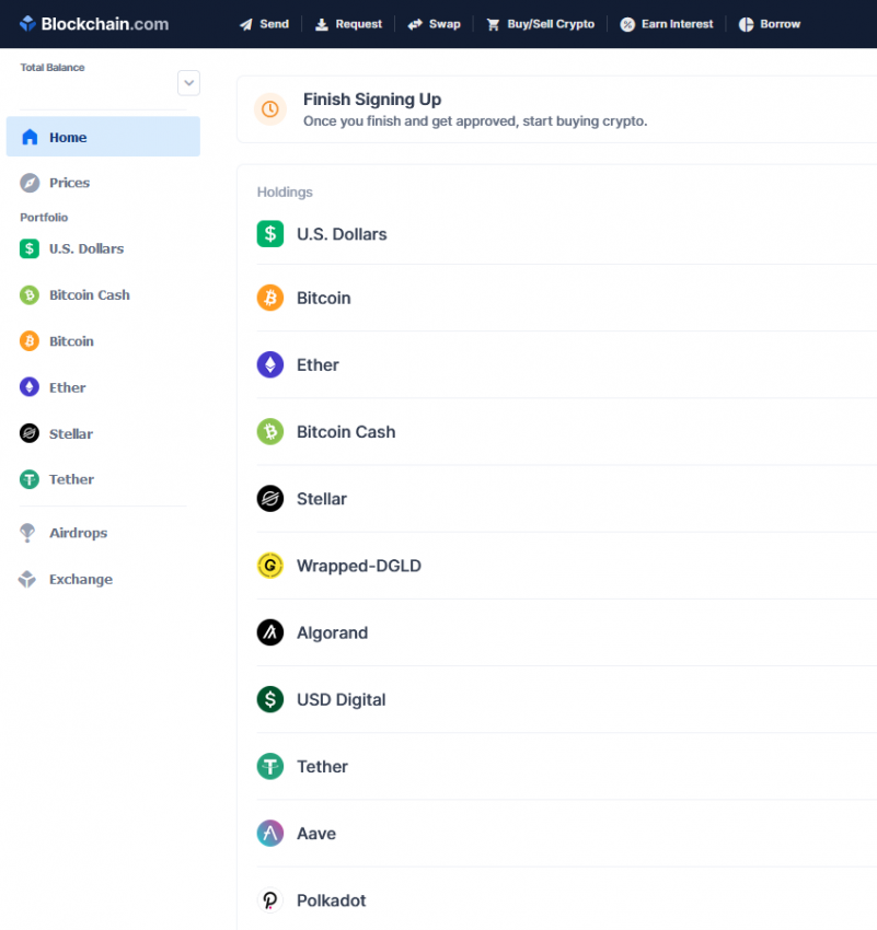 Самый первый кошелёк, который много лет назад я завёл - это blockchain.com Регистрация и функционал элементарные, позволяет работать с BitCoin (BTC), Ethereum (ETH), BitCoin Cash (BCH), Stellar (XLM), Tether (USDT) и другими (о Tether мы поговорим отдельно чуть ниже). Личный кабинет выглядит так:
