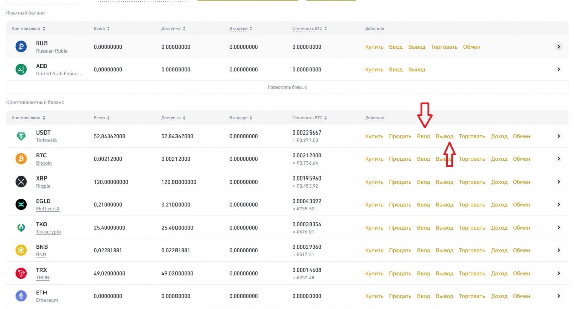 Вам откроется список всех монет, торгуемых на бирже и показан ваш текущий баланс по ним. Справа от названия любой монеты вы можете нажать кнопку "ввод" и, следуя инструкциям, пополнить свой баланс с любого другого кошелька. Таким же образом можно вывести ваши активы на любой сторонний криптовалютный кошелёк, воспользовавшись для этого кнопкой "вывод". Также в данном разделе вы можете пополнить свой баланс рублями, используя фиатные кошельки Payeer или AdvCash. Всё очень просто, быстро, а главное, интуитивно понятно