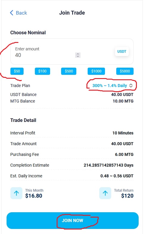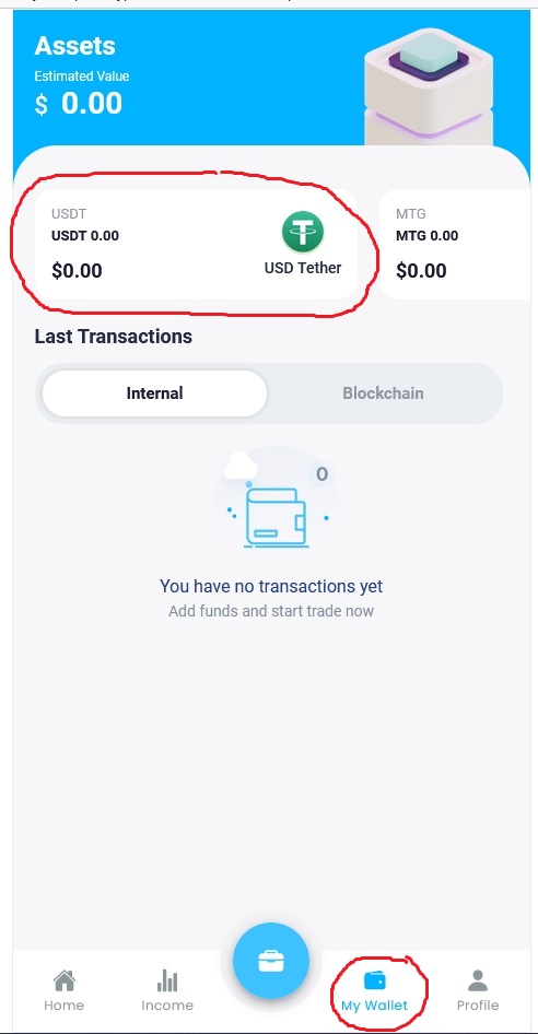 3) Buy MTG tokens to pay commissions (remember: 15% of the deposit amount, plus a little for the initial profit collection). To do this, in the same section My Wallet, click on the USDT or MTG block , click the Swap button - enter the amount and confirm the action