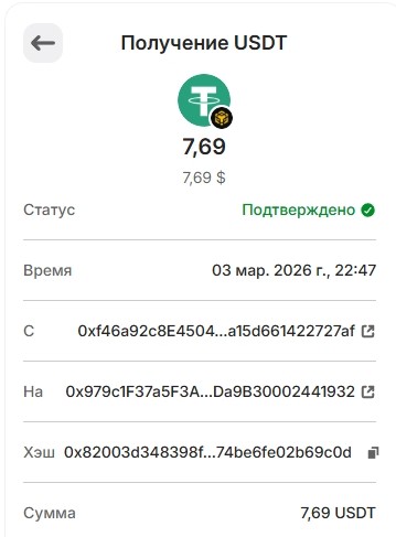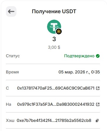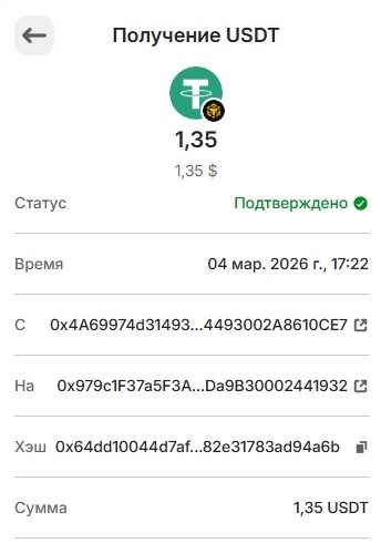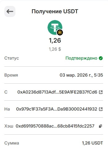 1 USDT 01.03.2026 0xf8c1d68ce5776daf463dff2ff66df8b8ae0cc6f3341d3f1bbf14b418ee463780